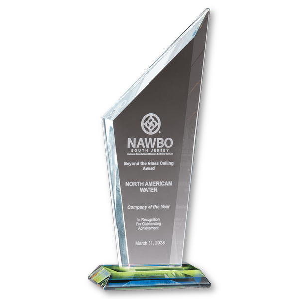 Clear 3/8" thick beveled optical quality glass mounted on a unique prism base. Prices include your etched message of appreciation and logo.