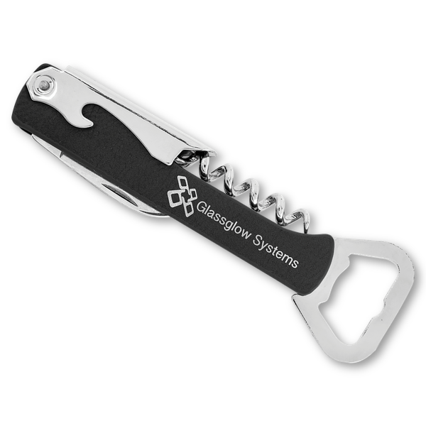 1.25 x 5.25 Stainless steel and black leatherette opener with personalized laser engraving. The perfect accompaniment to the gift bottle of wine. Something they will cherish and use long after the bottle has been emptied.