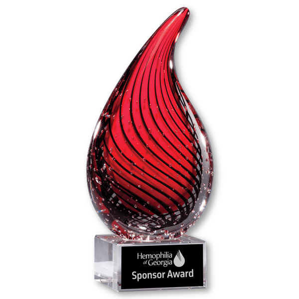 7 1/2" Red Teardrop Art Glass on Clear Glass Base with laser engraved black plate. Includes your logo and award text.