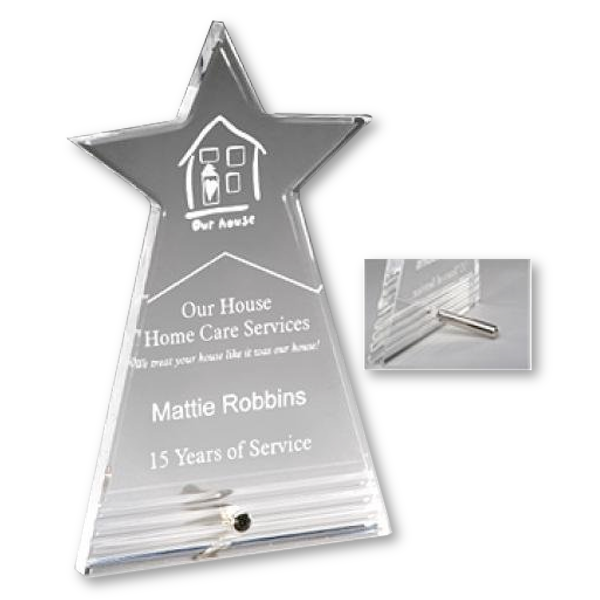 1/2" thick clear acrylic star is freestanding with a screw-in silver stand mounted at the bottom of the award. Modern and stylish, this award is perfect for group and individual accomplishments.