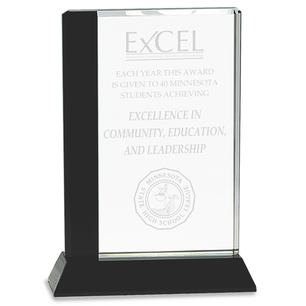 Black edge crystal fused to clear crystal that is etched with your logo and awards personalization and fused to a black glass base. A bold look for added appeal.