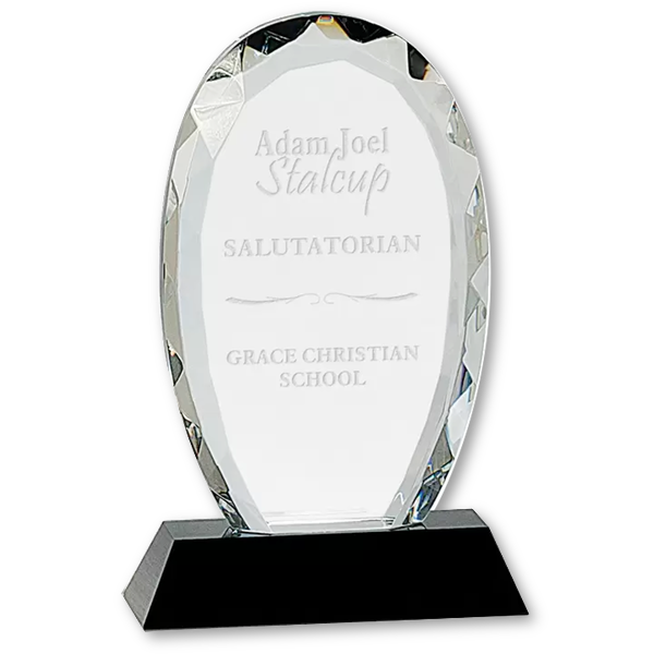 Oval Facet Clear Optical Crystal on Black Glass Base. Etched with your logo and text to make an award that will be a beautiful addition to any office or study.