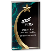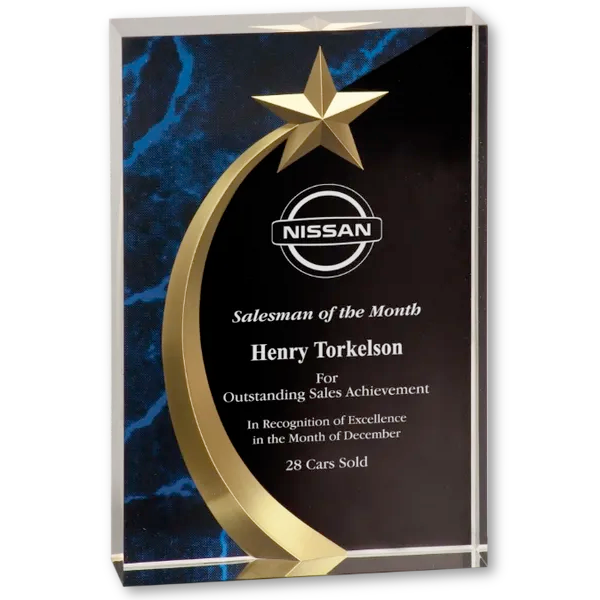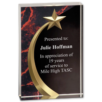A self standing clear acrylic rectangle with a marbleized highlight and a solid black area for laser engraved personalization. The marbleized accent area is separated by a 3 dimensional reverse carved gold shooting star for an ultrahigh impact award.