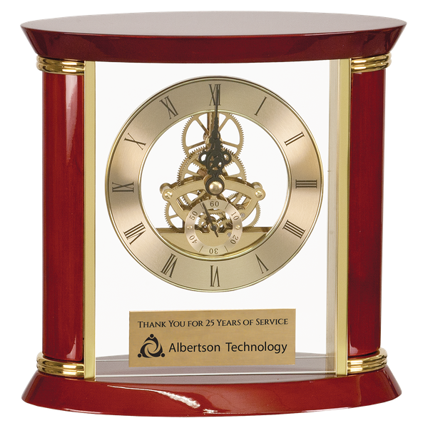 Piano finished Rosewood with Brass Accents and elegant floating clock with exposed mechanics. Includes a personalized brass plate.