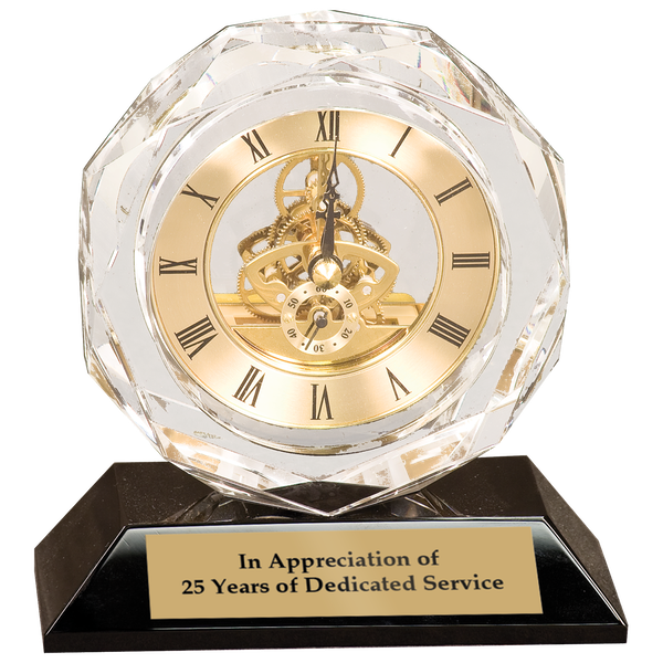 A beautiful 5 3/4 inch tall crystal clock with exposed clockworks on a black glass base. Includes a personalized brass plate and deluxe presentation box.