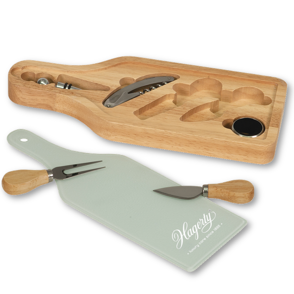 Get the party started with a handy cheese and wine set. The durable glass top is laser engraved with your logo or message of appreciation. Tools included are corkscrew, stopper, drip collar and cheese knife and fork.