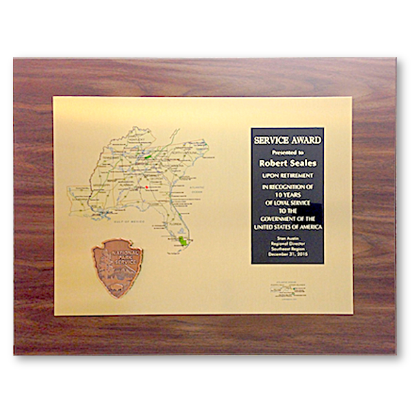 This 15" x 18" award plaques includes a regional map, bronze NPS arrowhead logo, and personalization with Name, Years of Service, and Retirement Date. Plate can be customized for other recognition options. PLEASE SPECIFY RECIPIENTS' NAME, YRS OF SERVICE, AND RETIREMENT DATE