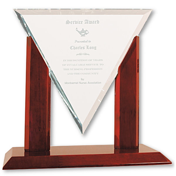 Your message is etched in a brilliant crystal triangle suspended on a rosewood base. It is an incredible award that would belong in the office or home of any executive.