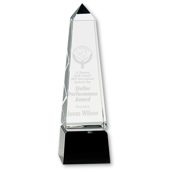 Tall crystal obelisk fused to a black glass base. A classic symbol of accomplishment given a new modern appearance. Perfect for timeless achievement.