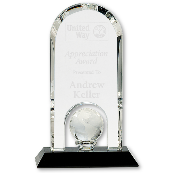 The crystal clear Arch features ample room for etched personalization. It sits above a crystal globe for a spectacular award.