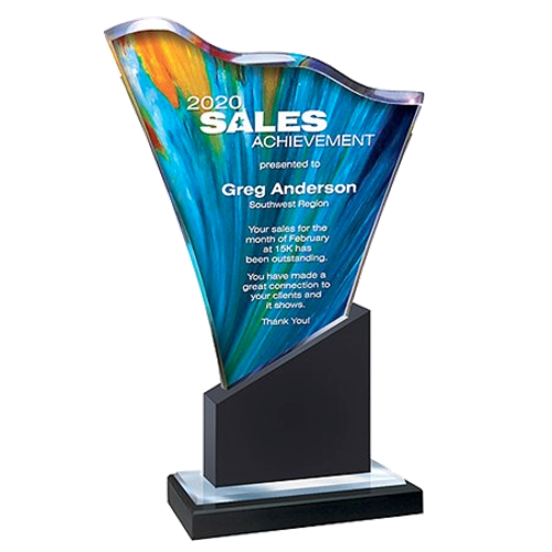 For an award that demands attention, this colorful and unique design is assured to turn heads. Your awards text is laser engraved into clear acrylic which stands out against a colorful wave of blues and greens.