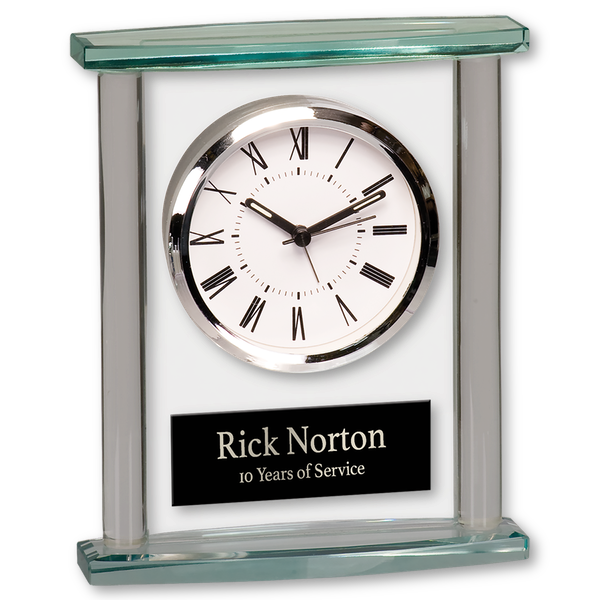 Elegant and subtle, this all glass clock features a sophicated and easy to read dial. Price includes personalization on a black or silver plate. Gift box included.