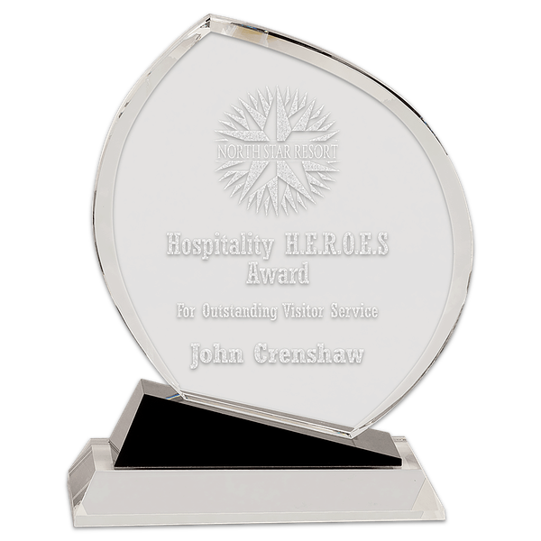 Our Crystal Oblong Trophy features a unique crystal piece made with 3/4″ thick crystal. It has black accents & is mounted on a clear crystal base. It is packaged in a deluxe gift box