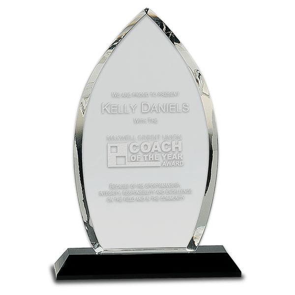 Beautiful clear optical crystal with brilliant edges on a black glass base. Etched with your logo and personalization it makes a truly memorable award.