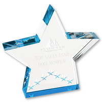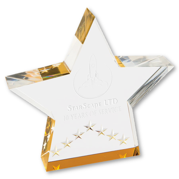 1" thick acrylic with reflective highlight color bottom and carved star accents. Laser engraved with your logo and award message.