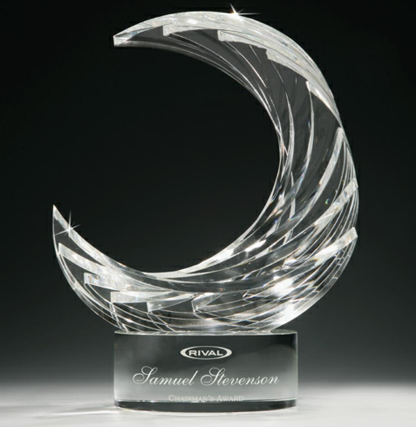 Eight individually hand faceted pieces of optical crystal are cut into crescents and attached together in this artful shape resembling the crest of a wave. The sculpture is mounted on a circular block of optical crystal creating this extraordinary gallery quality award.