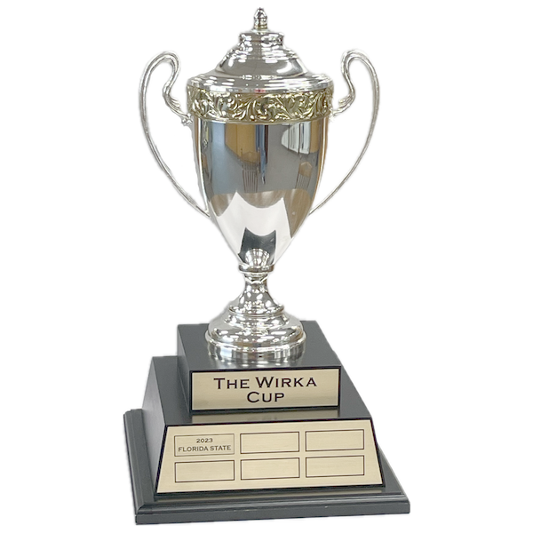 18" tall trophy featuring a metal cup with silver finish and gold color highlights sits upon a wood tiered base with personalized plate. Shown with optional multi-year plates (update plates sold separately) An impressive award suitable for a championship cup.