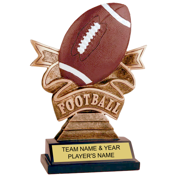 A great trophy for your football team. Features beautifully detailed football onto of an antique gold ribbon. Includes a personalized plate with Team Name, Year, and Player's Name