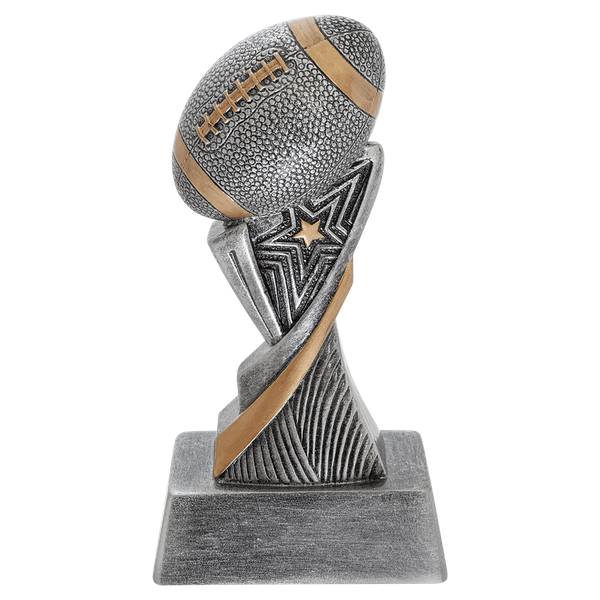 Everyone is a winner with this trophy featuring an antique silver finish with gold highlights and football. Includes a personalized plate with Team Name, Year, and Player's Name. Avaiable is 6" and 8" tall sizes.