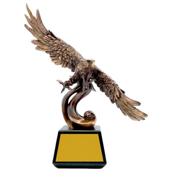 This beautifully detailed antique bronzed resin eagle sits upon a black wood base. It's personalized with your logo and text on a brushed gold plate.