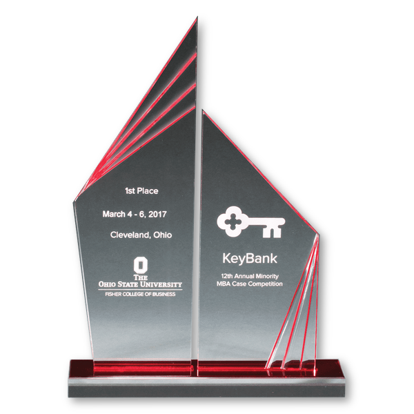 Double zenith acrylic with red mirror accent. 0.5" thick clear acrylic. Individually gift boxed.