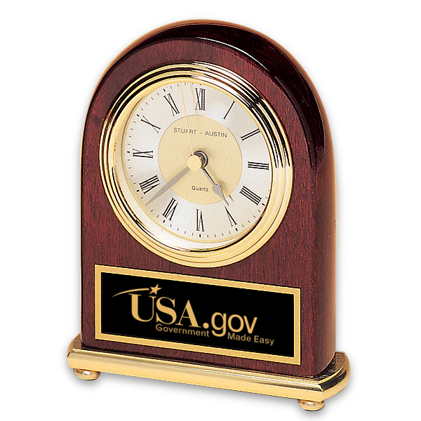 5"H x 4"W x 1"D This elegant desk clock features a two-tone diamond-spun dial, offering a timeless and refined design. The hand-rubbed rosewood casing adds a touch of class, complemented by a quartz three-hand movement for precision and reliability. Elevated on a luxurious brass-tone base, this clock is both stylish and durable. With ample space for logo and text imprinting, it’s an ideal promotional gift or recognition award. Perfect for celebrating years of service or honoring corporate milestones.